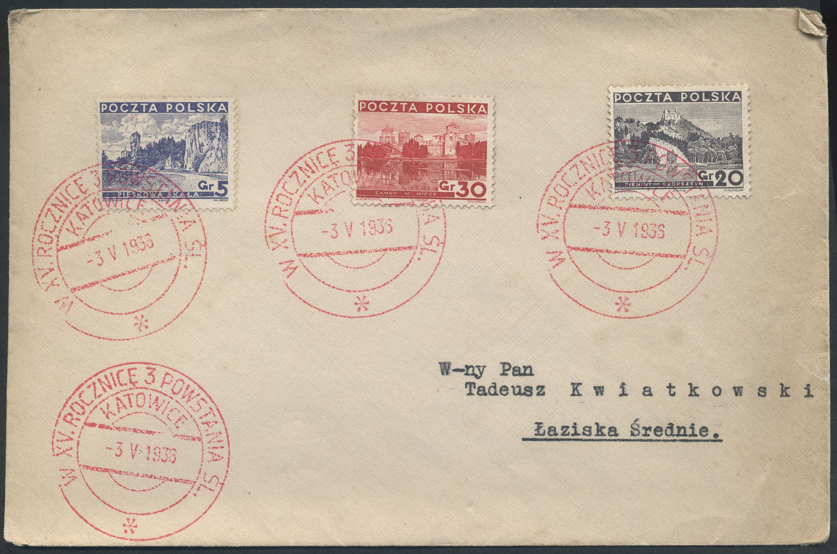 1936 stempel okolicznościowy "W XV ROCZNICĘ 3 POWSTANIA ŚL." Katowice. | Fi.280, 283, 285 |
