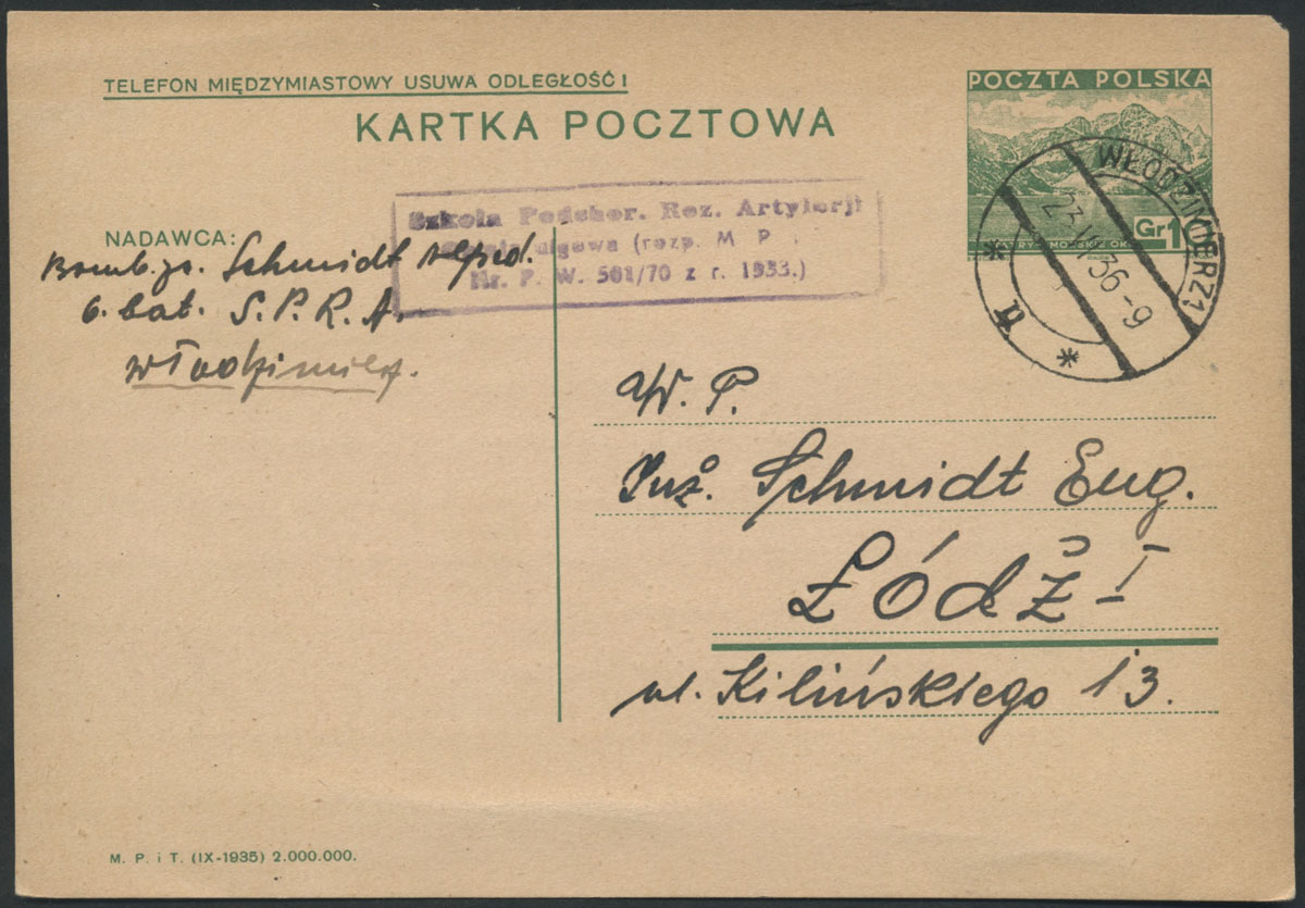1936 kartka z Włodzimierza do Łodzi, stempel opłaty ulgowej "Szkoła Podchor. Rez. Artylerji opłata ulgowa (rozp. M.P. i T. / Nr. PW. 501/70 z r. 1933)" uprawniający żołnierzy służby czynnej do obniżonej opłaty za korespondencję. | Fi.Cp69 |