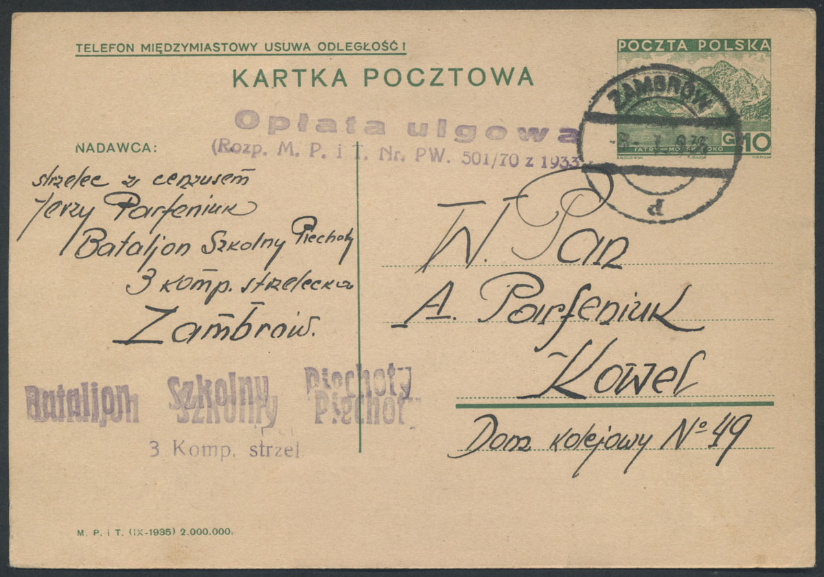 1936 kartka z Zambrowa do Kowla, stempel "Batalion Szkolny Piechoty 3 Komp. strzel." i opłaty ulgowej "Opłata ulgowa (rozp. M.P. i T. / Nr. PW. 501/70 z r. 1933)" uprawniający żołnierzy służby czynnej do obniżonej opłaty za korespondencję. | Fi.Cp69 |