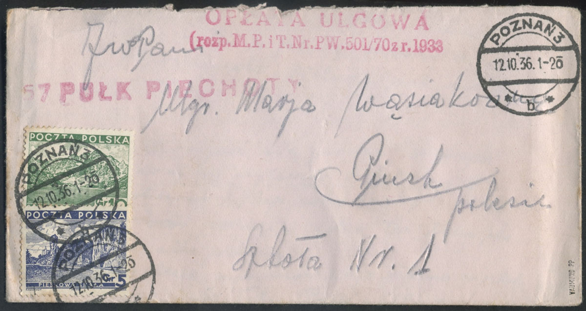 1936 list z Poznania do Pińska, stempel "57 PUŁK PIECHOTY" i stempel "OPŁATA ULGOWA (rozp. M.P. i T. / Nr. PW. 501/70 z r. 1933)" uprawniający żołnierzy służby czynnej do obniżonej opłaty za korespondencję. | Fi.280, 295 |