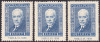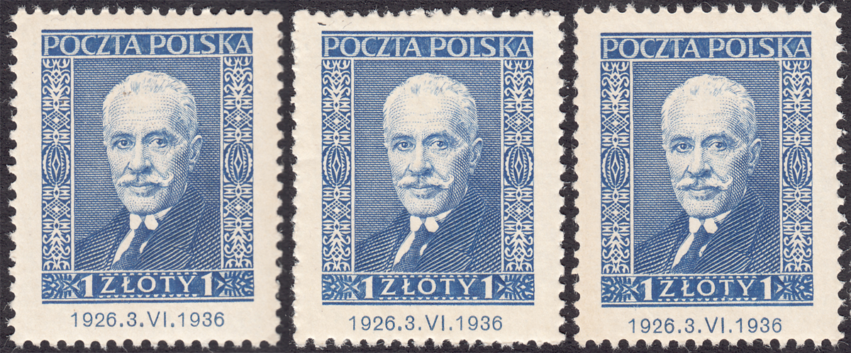 1936 10-lecie prezydentury Ignacego Mościckiego, trzy czyste znaczki za 1 zł., każdy z innym położeniem napisu względem rysunku, dodatkowo na pierwszym znaczku rysunek jest wyraźnie obrócony w lewo w stosunku do napisu i ząbkowania, wszystkie w bardzo ładnym stanie. | Fi.291 Mi.312 |