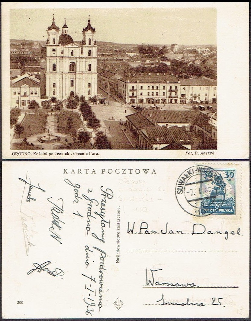 1936 kartka nadana w ambulansie pocztowym nr 107 na trasie Suwałki - Warszawa, datownik z wyróżnikiem a, datownik z tego ambulansu jest bardzo rzadko spotykany, na widokówce Grodno. | |