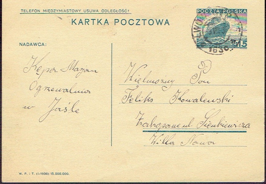 1936 kartka nadana w ambulansie pocztowym nr 163 na trasie Lwów - Stróże, datownik z wyróżnikiem c. | |