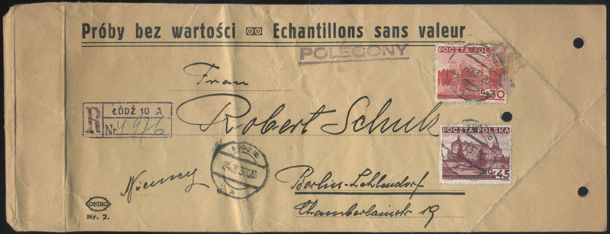 1937 próbka towarowa, firmowy list polecony z Łodzi do Niemiec, opłata według taryfy za druki, na kopercie napis "Próba bez wartości -...". | Fi.285, 286 |