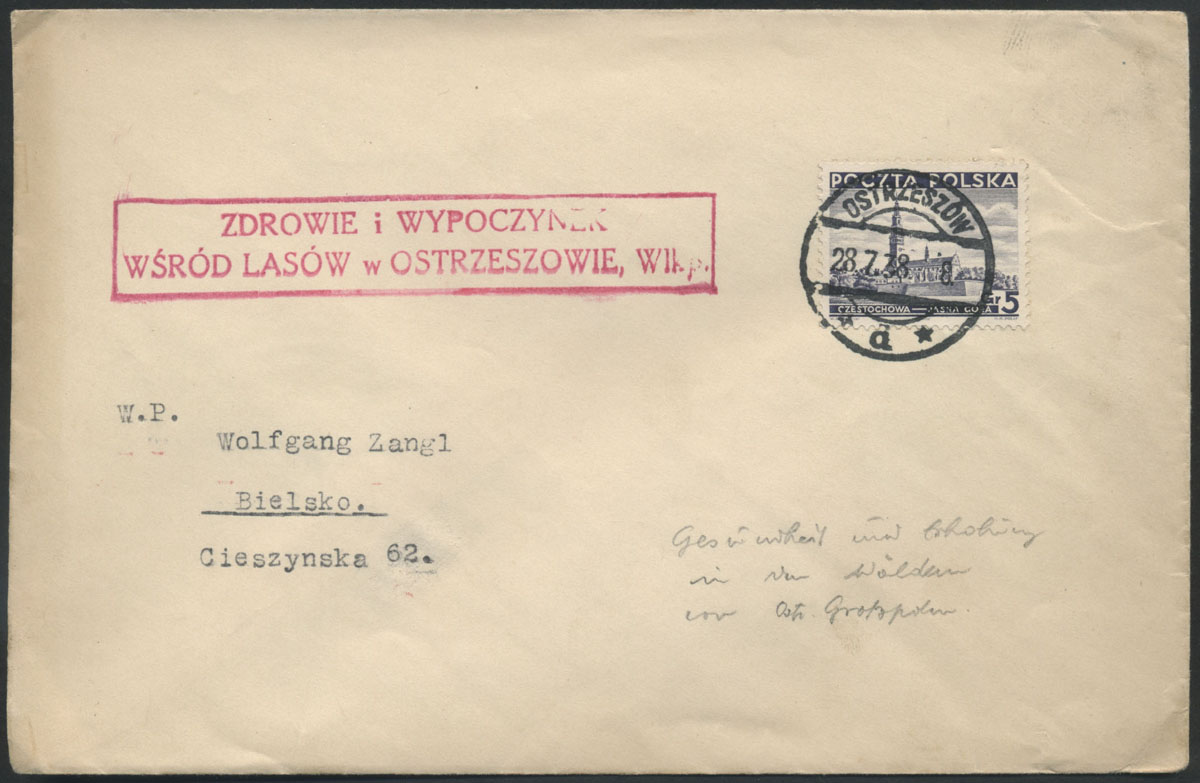 1938 stempel okolicznościowy "ZDROWIE i WYPOCZYNEK WŚRÓD LASÓW w OSTRZESZOWIE, Wlkp." Ostrzeszów. | Fi.294 |