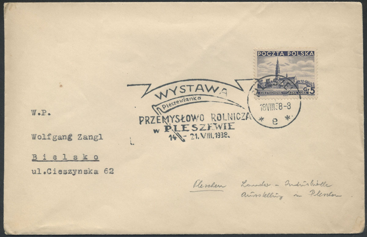 1938 "WYSTAWA PLESZEWIANKA PRZEMYSŁOWO ROLNICZA W PLESZEWIE 14-21.VIII.1938." Pleszew, datownik okolicznościowy odciśnięty 15.VII na karcie wysłanej do Warszawy, dobry stan zachowania (Myślicki 38 021). | Fi.295, Cp72 Mi.316 |