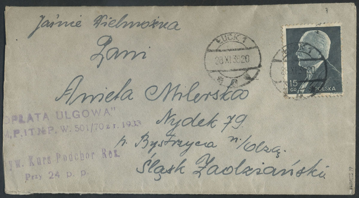 1938 list z Łucka do Bystrzycy, stempel "Dyw. Kurs Podchor Rez. Przy 24 p.p." i stempel "OPŁATA ULGOWA (rozp. M.P. i T. / Nr. PW. 501/70 z r. 1933)" uprawniający żołnierzy służby czynnej do obniżonej opłaty za korespondencję. | Fi.303 |
