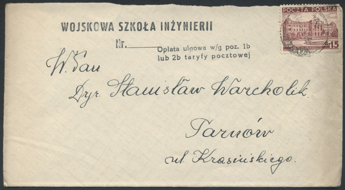 1938 list z Warszawy do Tarnowa, stempel "WOJSKOWA SZKOŁA INŻYNIERII" oraz stempel "Opłata ulgowa w/g poz. 1b lub 2b taryfy pocztowej" uprawniający żołnierzy służby czynnej do obniżonej opłaty za korespondencję. | Fi.296 |