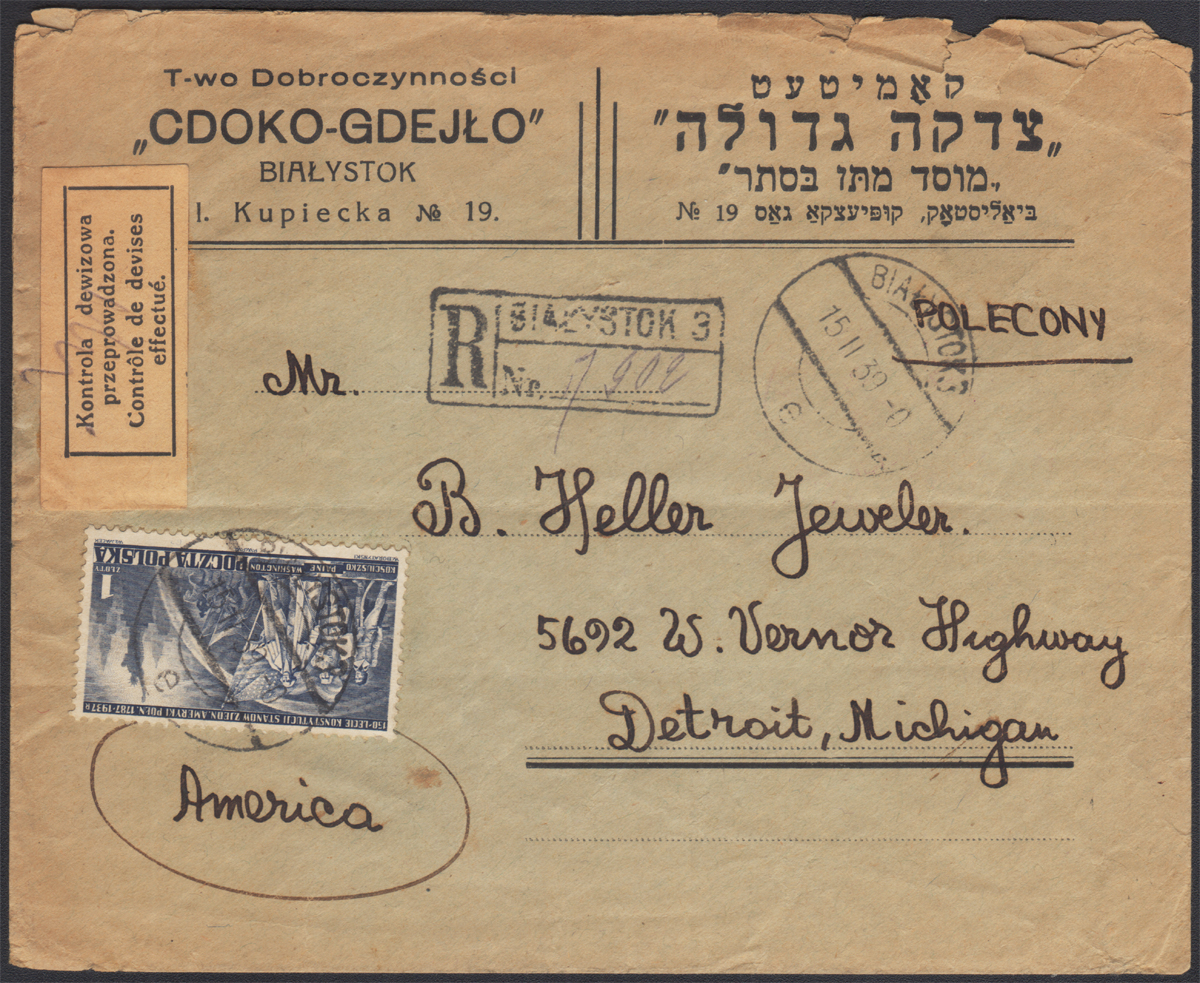 1938 150. rocznica uchwalenia konstytucji Stanów Zjednoczonych, 1 zł - frankatura pojedyncza, list polecony wysłany 15.II.39 z Białegostoku do Detroit, znaczek skasowany datownikiem BIAŁYSTOK 3 z wyróżnikiem "e", stempelek polecenia; nalepka kontroli dewizowej; koperta firmowa z napisami po polsku i hebrajsku "T-wo Dobroczynności CDOKO-GDEJŁO BIAŁYSTOK Ul.Kupiecka No 19"; na odwrocie datowniki odbiorcze z 25 i 27 lutego; dobry stan zachowania; temat - JUDAICA. Założycielem i członkiem Żydowskiego Towarzystwa Dobroczynnego CDOKO-GDEJŁO był Samuel Hirsch Cytron (1863–1935) supraski i białostocki fabrykant sukienniczy, właściciel firmy ”S. H. Cytron”, założyciel spółki ”Supraślska Sukienna Manufaktura S. H. Cytron. Spółka Akcyjna”, członek Związku Białostockiego Wielkiego Przemysłu, właściciel wielu nieruchomości na terenie Białegostoku, społecznik i filantrop. | Fi.305 Mi.326 |
