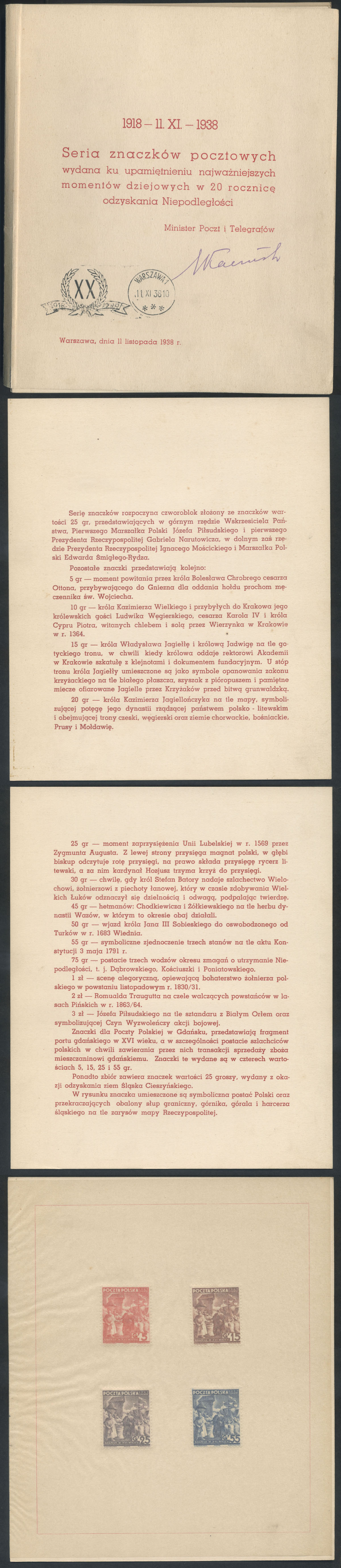 1938 20. rocznica odzyskania niepodległości, specjalny karnet wydany przez Pocztę Polską z podpisem ministra Poczt i Telegrafów, zawierający luźne kartki ze znaczkami serii historycznej (bez bloku), również tej dla polskiej poczty w Gdańsku. | Fi.310-22, Pg 31-4 |