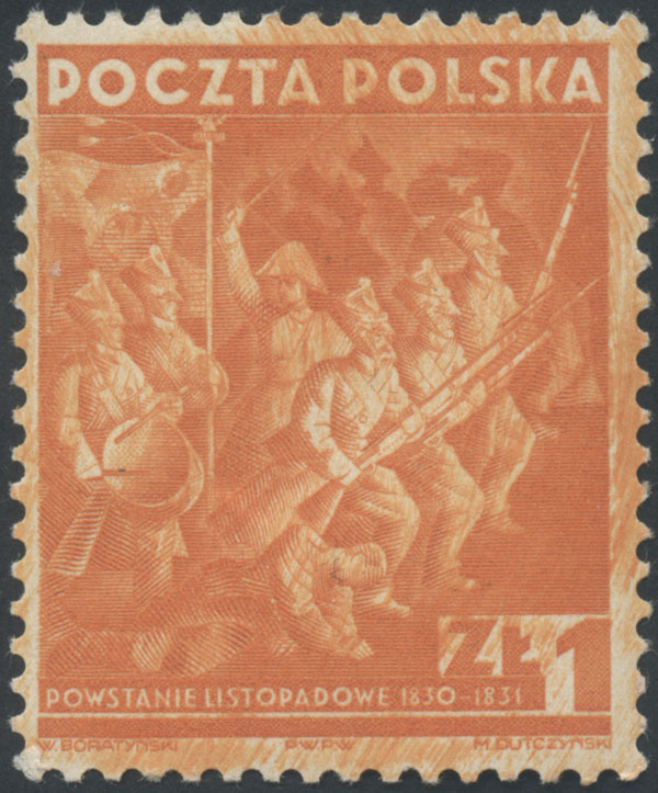 1938 20. rocznica odzyskania niepodległości, seria historyczna, w tym dwa znaczki za 15 gr: Fi.312 - w dolnej części widać dwa krzyżackie miecze - odwołanie do bitwy pod Grunwaldem z 1410 roku, wskutek niemieckiej interwencji dyplomatycznej, sporządzono nowy nakład, gdzie w miejscu mieczy umieszczono tarczę z Orłem Białym i Pogonią oraz lilie andegaweńskie - Fi.334; kasowana (Fi.85.-). | Fi.310-22, 334 Mi.331-43, 355 |