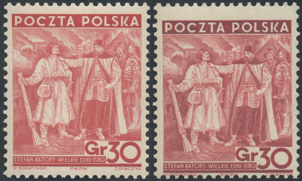 1938 20. rocznica odzyskania niepodległości - seria historyczna, w tym dwa znaczki za 15 gr: Fi.312 - w dolnej części widać dwa krzyżackie miecze - odwołanie do bitwy pod Grunwaldem z 1410 roku, wskutek niemieckiej interwencji dyplomatycznej, sporządzono nowy nakład, gdzie w miejscu mieczy umieszczono tarczę z Orłem Białym i Pogonią oraz lilie andegaweńskie - Fi.334; czyste (Fi.252,50), bardzo dobry stan zachowania. | Fi.310-22, 334 Mi.331-43, 355 |