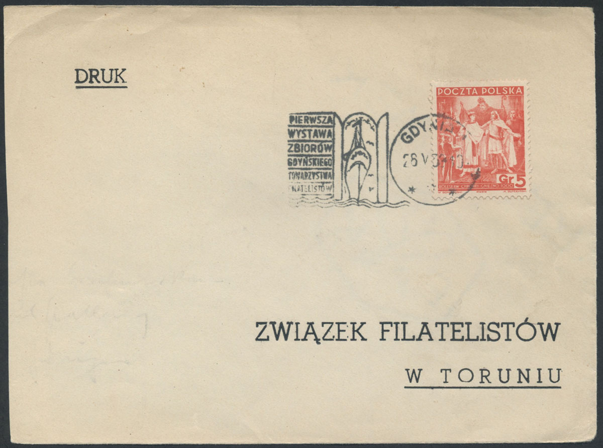 1938 stempel okolicznościowy "PIERWSZA WYSTAWA ZBIORÓW GDYŃSKIEGO TOWARZYSTWA FILATELISTÓW" Gdynia. | Fi.310 |