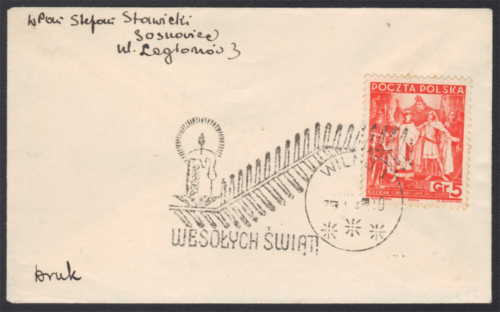 1938 "WESOŁYCH ŚWIĄT" Wilno 1, okolicznościowy wirnik odciśnięty na kopercie wizytówkowej wysłanej do Sosnowca; bardzo dobry stan zachowania (Myślicki 38 045). | Fi.310 Mi.331 |