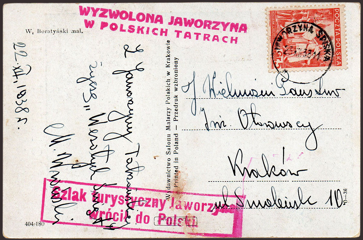 1938 okupacja Zaolzia - Spisz, kartka Jaworzyny Spiskiej do Krakowa, dodatkowe stemple kolorze czerwonym: "WYZWOLONA JAWORZYNA / W POLSKICH TATRACH" i "Szlak turystyczny Jaworzyna / wrócił do Polski". | Fi.310 |