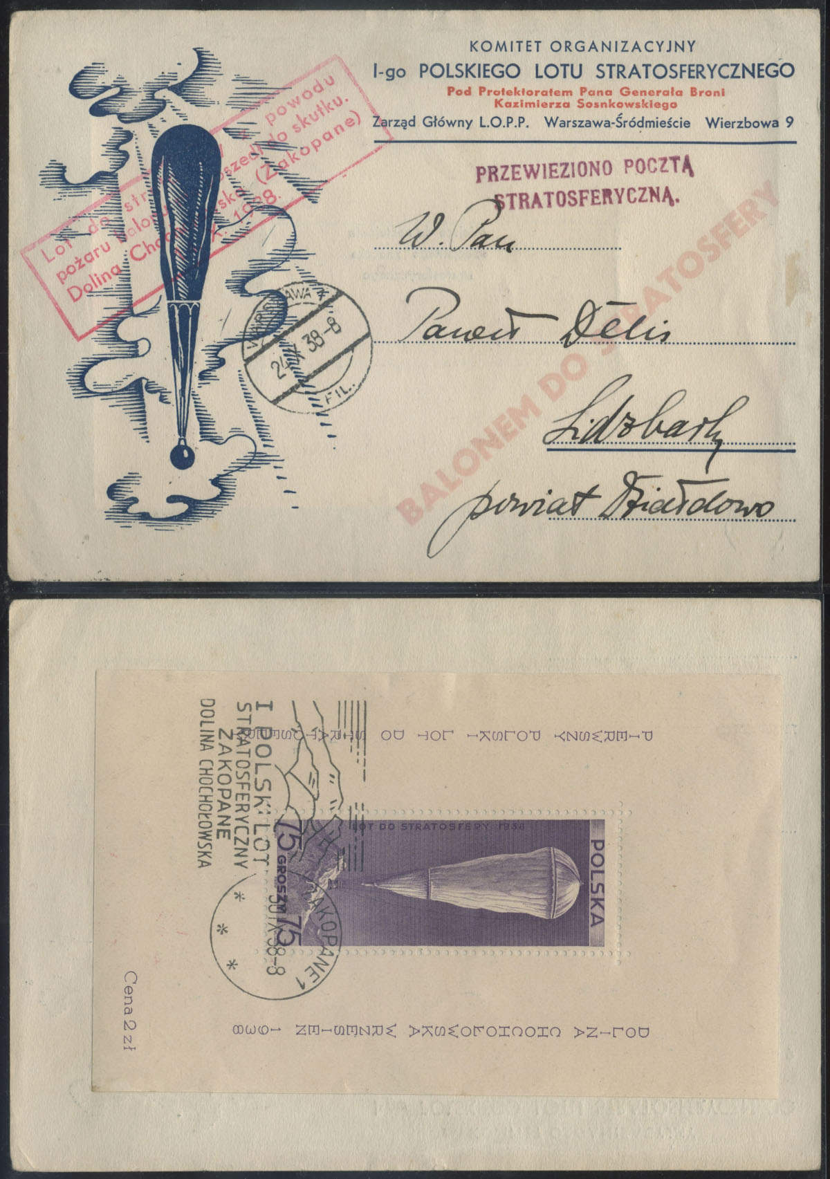 1938 pierwszy polski lot do stratosfery, specjalna kartka z niedoszłego do skutku lotu. | Fi.bl.6 Mi.Bl.6 |