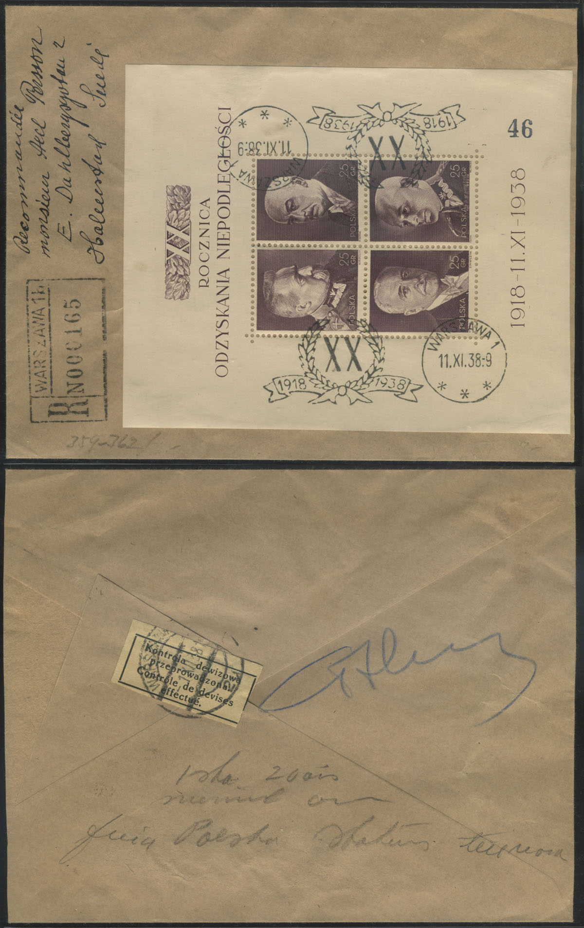 1938 20. rocznica odzyskania niepodległości, blok na liście poleconym z Warszawy do Niemiec, nalepka kontroli dewizowej. | Fi.bl.7 Mi.Bl.7 |