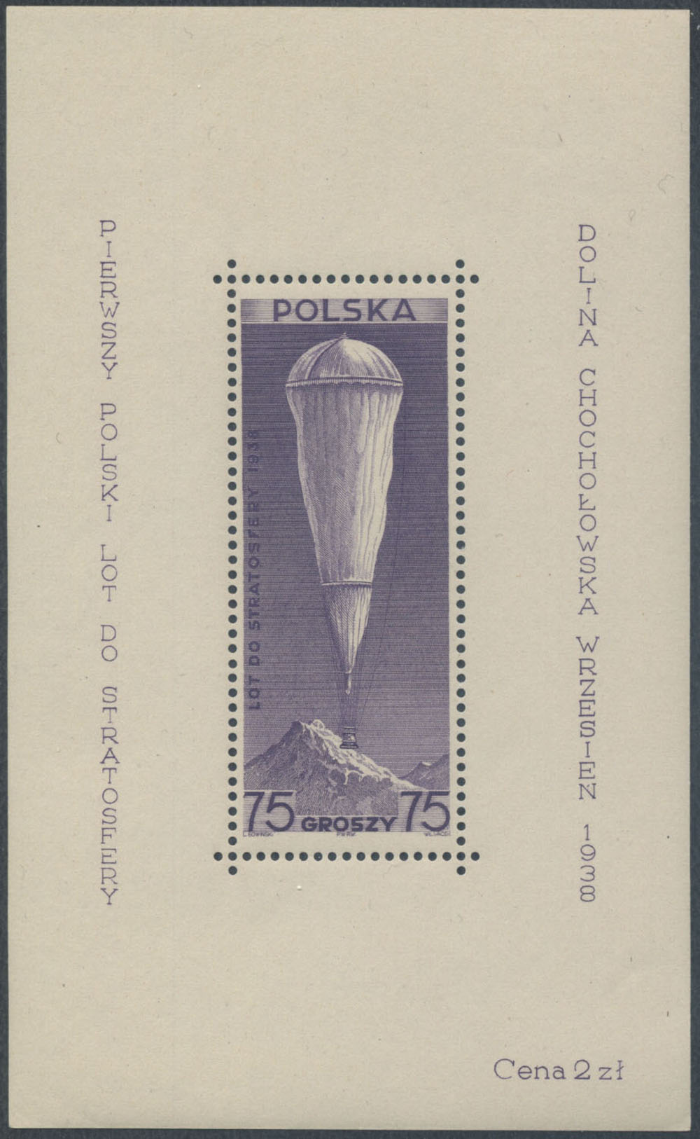 1938 blok okolicznościowy na kartce z niedoszłego do skutku pierwszego polskiego lotu do stratosfery. | Fi.bl.6 Mi.Bl.6 |