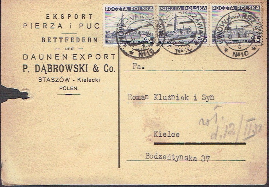 1938 adres pomocniczy (skart - paczkowy), paczka została wysłana z Ostroroga do Gdyni, na skarcie znaczek dopłaty za doręczenie paczki. | |