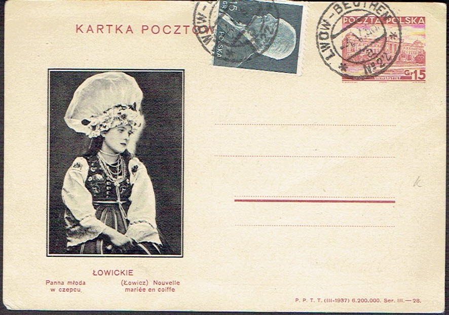 1938 V Ogólnopolska Wystawa Filatelistyczna, okolicznościowa karta przedstawiająca reprodukcję obrazu A.Kędzierskiego "Sztajnkelerka" wydana z okazji wystawy w niewielkim nakładzie 400 sztuk; bardzo dobry stan zachowania. | |