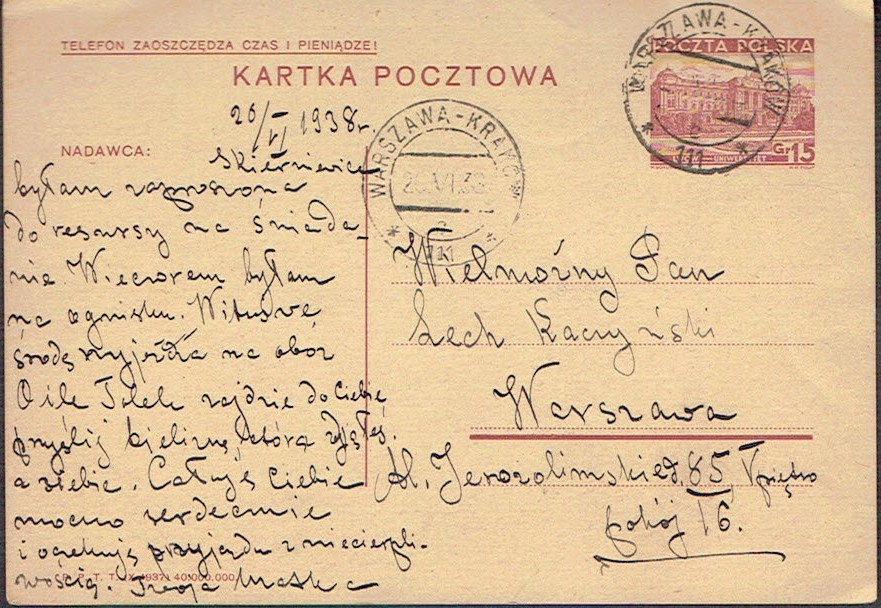 1938 kartka nadana w ambulansie pocztowym nr 111 na trasie Warszawa - Kraków, datownik z wyróżnikiem c. | |