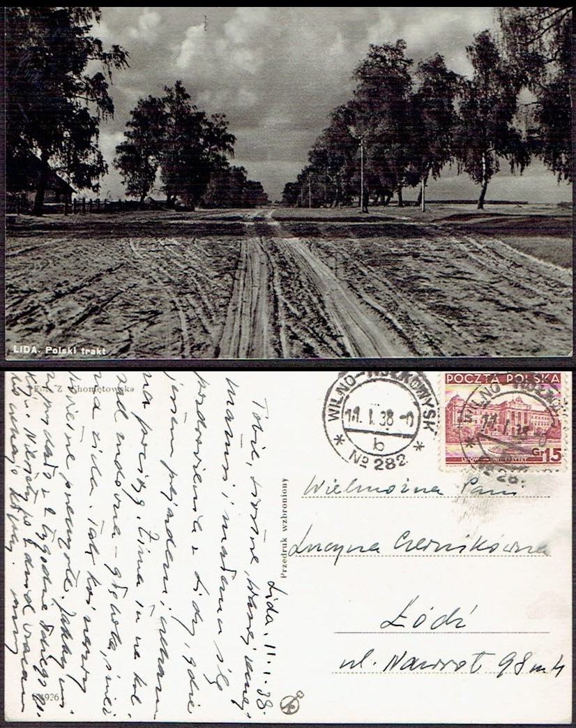 1938 kartka nadana w ambulansie pocztowym nr 282 na trasie Wilno - Wołkowysk, datownik z wyróżnikiem b. | |
