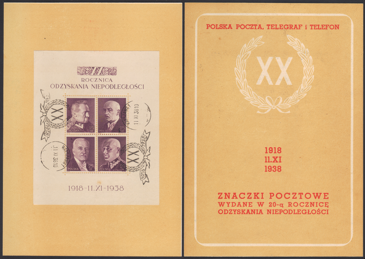 1938 20. rocznica odzyskania niepodległości, blok kasowany okolicznościowo w pierwszym dniu obiegu. | Fi.bl.7 |