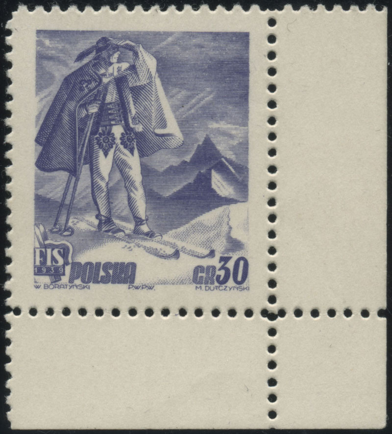 1939-48 Międzynarodowe Zawody Narciarskie FIS, narożnikowa offsetowa próba maszynowa w barwie fioletowej wykonana w Państwowej Wytwórni Papierów Wartościowych w celu sprawdzenia nowej maszyny drukarskiej, gwarancja Walocha. | Fi.332P |