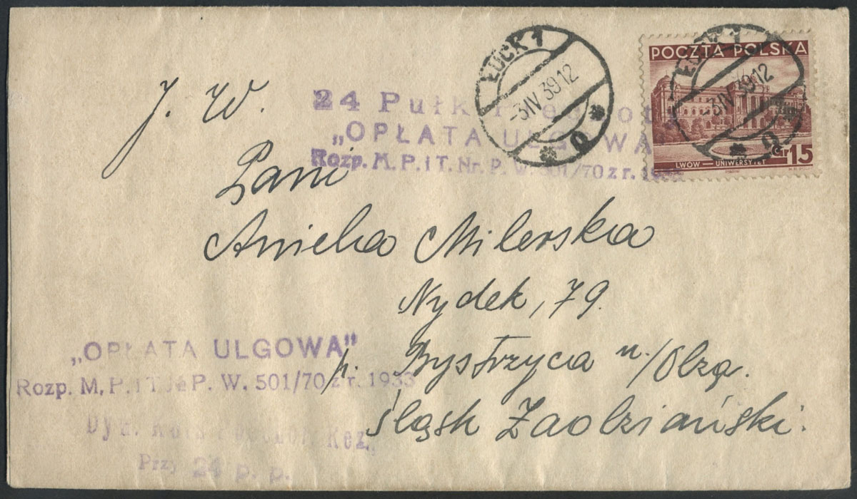 1939 list z Łucka do Bystrzycy, stempel "24 Pułk Piechoty "OPŁATA ULGOWA (rozp. M.P. i T. / Nr. PW. 501/70 z r. 1933)" uprawniający żołnierzy służby czynnej do obniżonej opłaty za korespondencję. | Fi.296 |