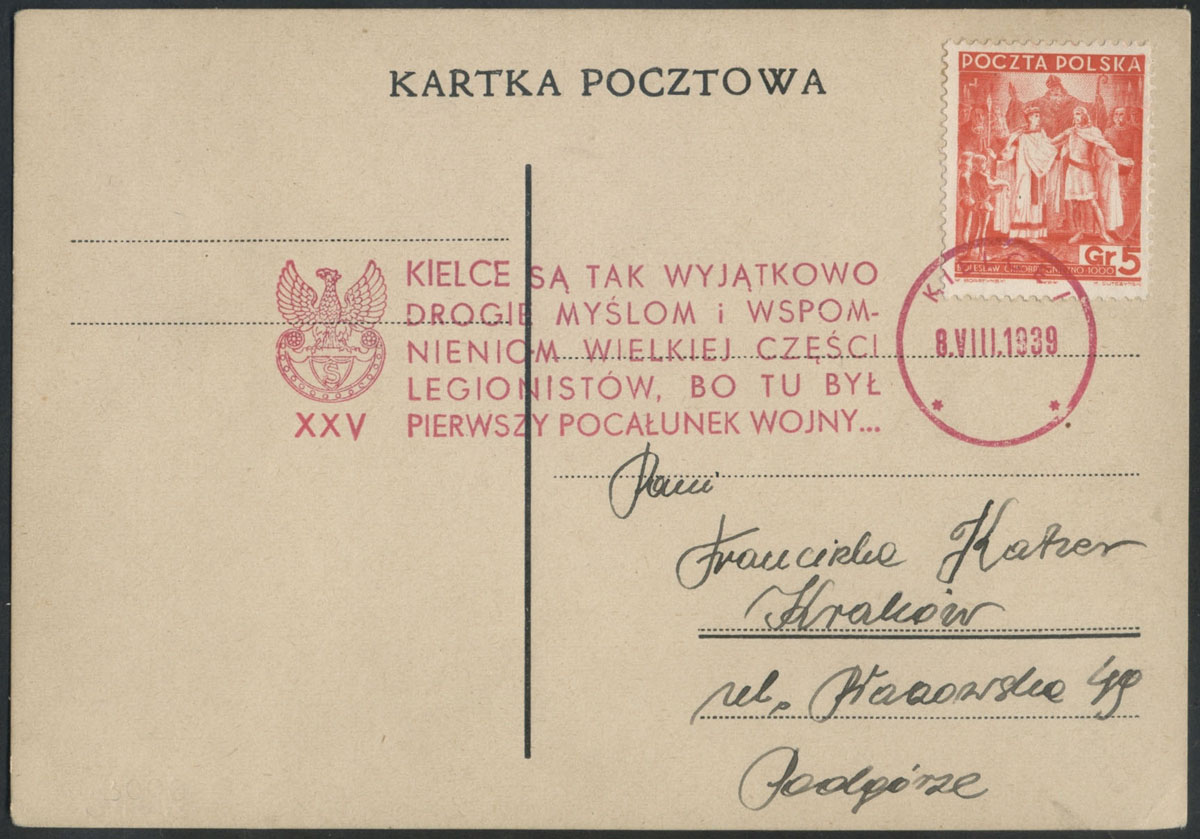 1939 stempel okolicznościowy "KIELCE SĄ TAK WYJĄTKOWO DROGIE MYŚLOM I WSPOMNIENIOM WIELKIEJ CZĘŚCI LEGIONISTÓW BO TU BYŁ PIERWSZY POCAŁUNEK WOJNY..." Kielce 1. | Fi.310 |