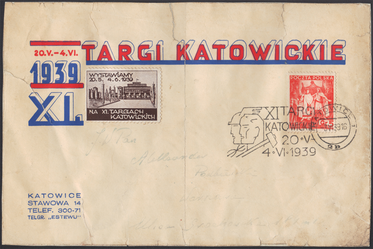 1939 XI TAGI KATOWICKIE - strona adresowa specjalnej koperty z dodatkową winietką targową ze znaczkiem skasowanym stemplem okolicznościowym "XI TARGI KATOWICKIE 20.V - 4.VI.1939" Katowice 1 (wyróżnik "2b"); rzadki walor w bardzo słabym stanie zachowania (podklejone na całej powierzchni). | Fi.310 Mi.331 |