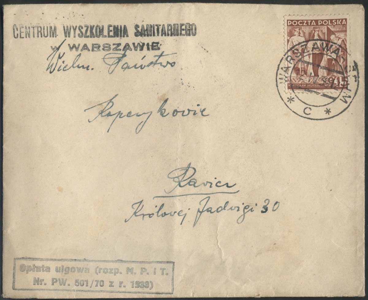 1939 list z Warszawy Sejm do Rawicza, stempel "CENTRUM WYSZKOLENIA SANITARNEGO w WARSZAWIE" i opłaty ulgowej "Opłata Ulgowa (rozp. M.P. i T. / Nr. PW. 501/70 z r. 1933)" uprawniający żołnierzy służby czynnej do obniżonej opłaty za korespondencję. | Fi.334 |