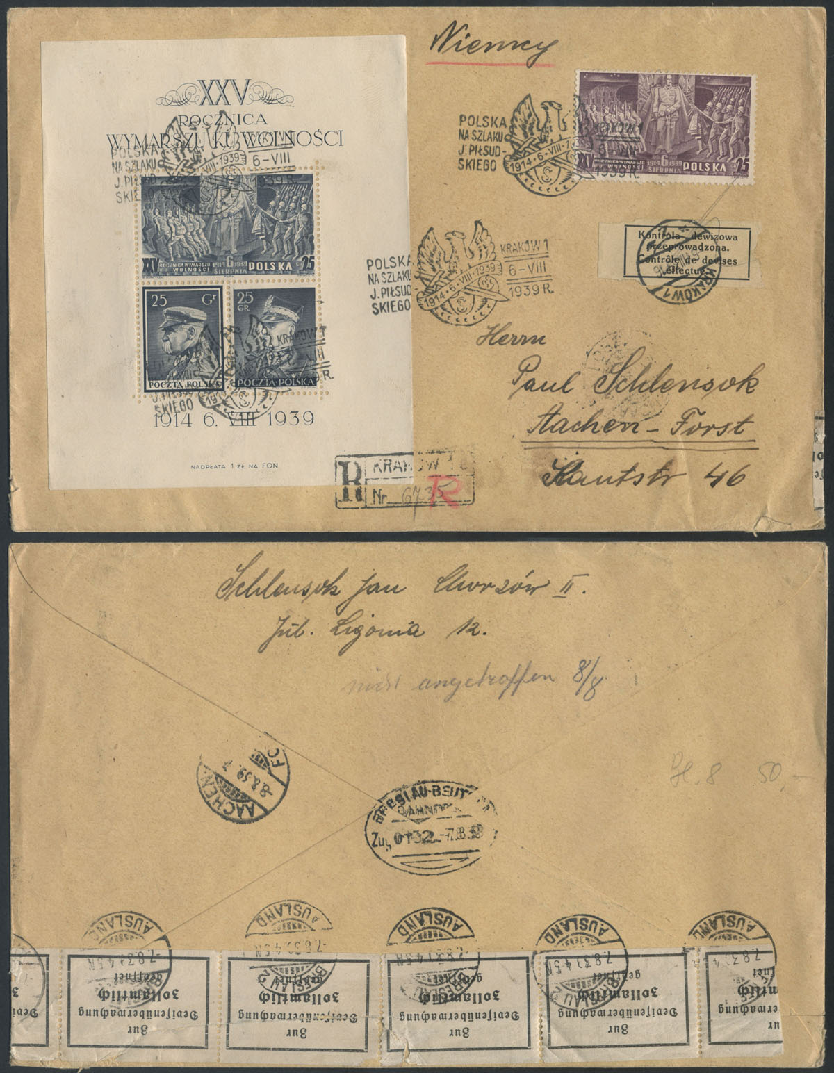 1939 25. rocznica wymarszu I Kompanii Kadrowej Legionów, blok na kopercie listu poleconego wysłanego 6.VIII z Warszawy do Przemyśla, skasowany stemplem okolicznościowym dokładnie w dniu rocznicy, kasownik odbiorczy na odwrocie (Myślicki 35 116). | Fi.bl.8 |
