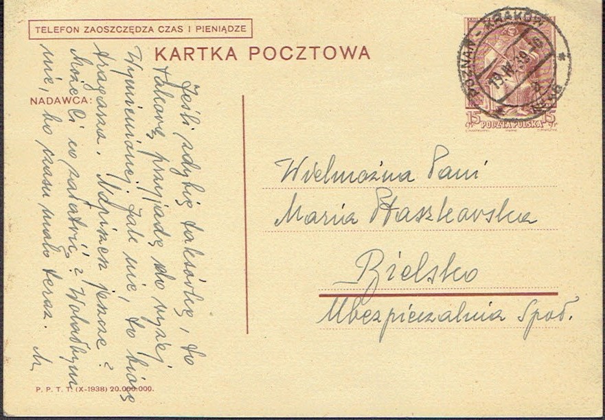 1939 kartka nadana w ambulansie pocztowym nr 46 na trasie Poznań - Kraków, datownik z wyróżnikiem a. | |