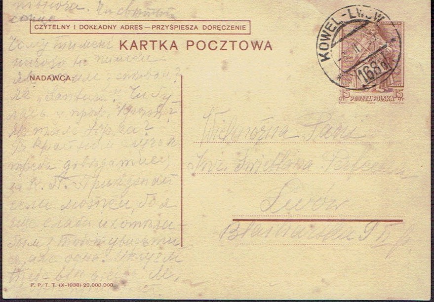 1939 kartka nadana w ambulansie pocztowym nr 168 na trasie Kowel - Lwów, datownik z wyróżnikiem b. | |