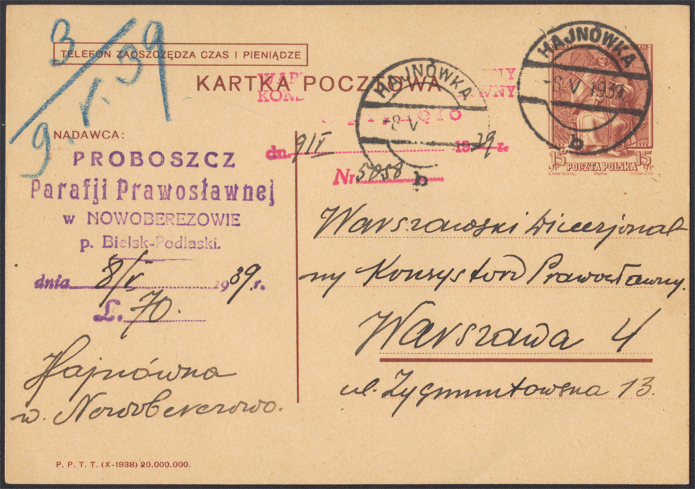 1939 karta pocztowa z miejscowości Nowo Berezowo od proboszcza parafii prawosławnej wysłana 8.V z Hajnówki do Warszawy, znak opłaty skasowany datownikiem HAJNÓWKA z wyróżnikiem "b", stemple: nadawcy i wpływu odbiorcy; bardzo dobry stan zachowania. | Fi.Cp81 |