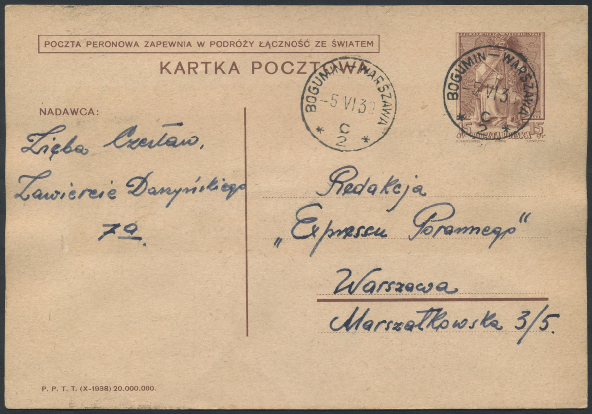 1939 kartka nadana w ambulansie pocztowym nr 12 na trasie Warszawa - Zebrzydowice, datownik z wyróżnikiem a. | |