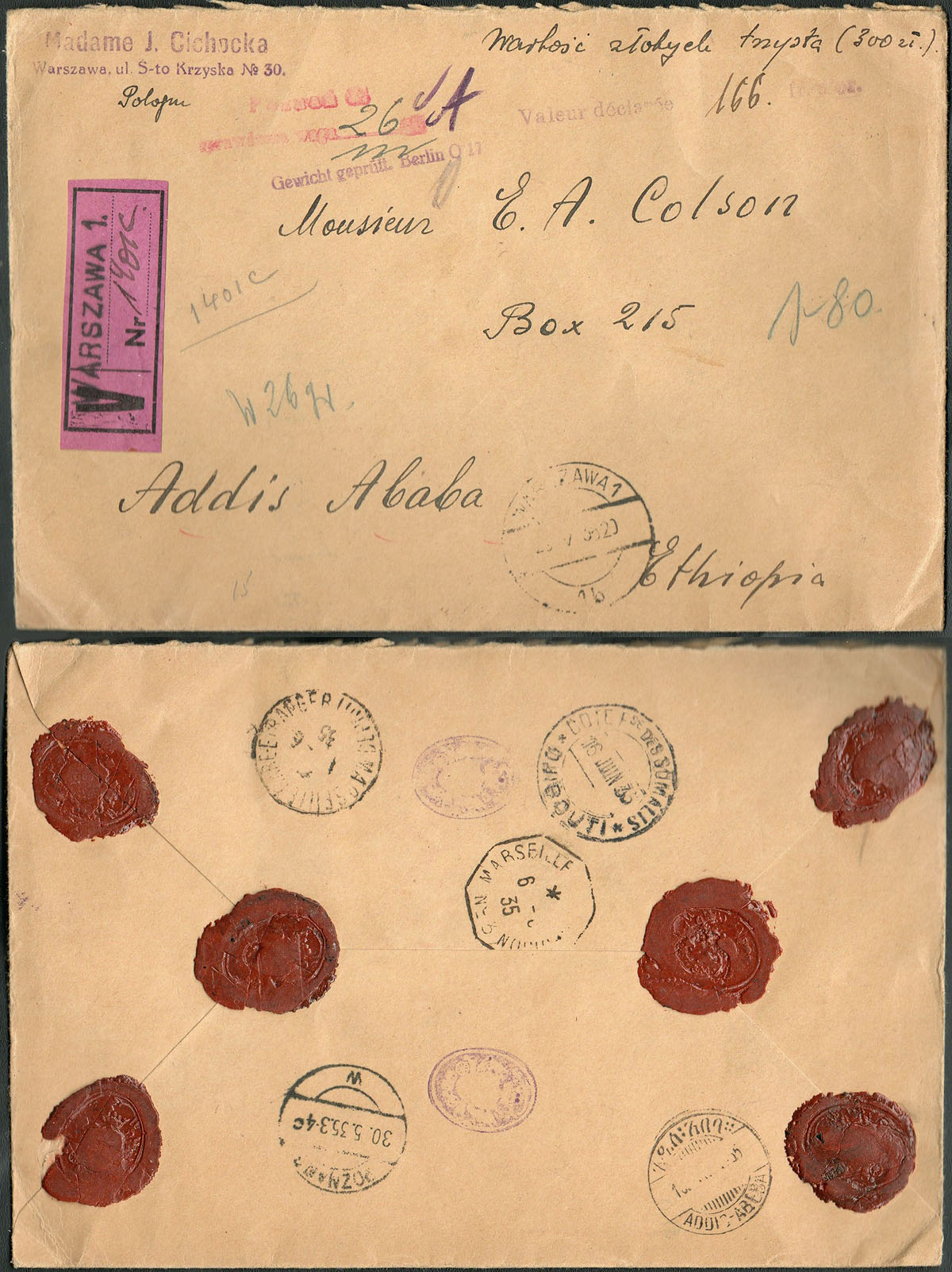 1939 listu wartościowy z Warszawy do Etiopii z udokumentowaną drogą przez Poznań, Berlin, Marsylię, statkiem do Dżibuti i lądem do Addis Abeby, rzadka destynacja i niezwykle ciekawy obieg pocztowy. | |