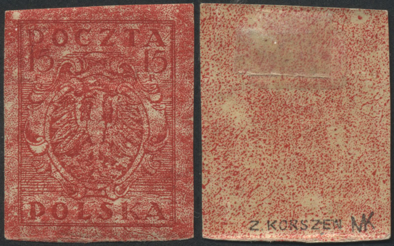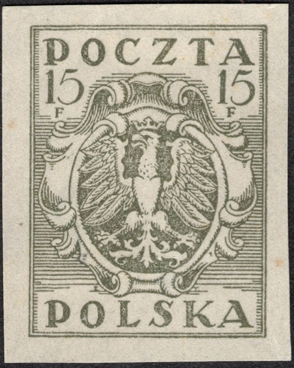 1919-20 wydanie w walucie markowej dla obszaru całej Rzeczypospolitej - nakład C, bardzo rzadka próba znaczka za 15 fen. w kolorze różowym na białym cienkim papierze, gwarancja Walocha. | Fi.88 P7 Mi.92 |