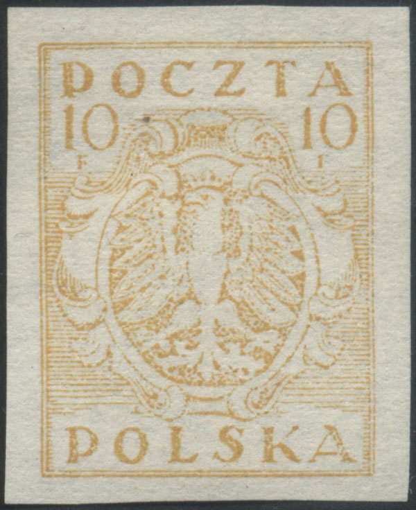 1919 wydanie w walucie markowej, niegumowana próba arkuszowa w barwie szarozółtej, gwarancja Walocha. | Fi.87P3 |