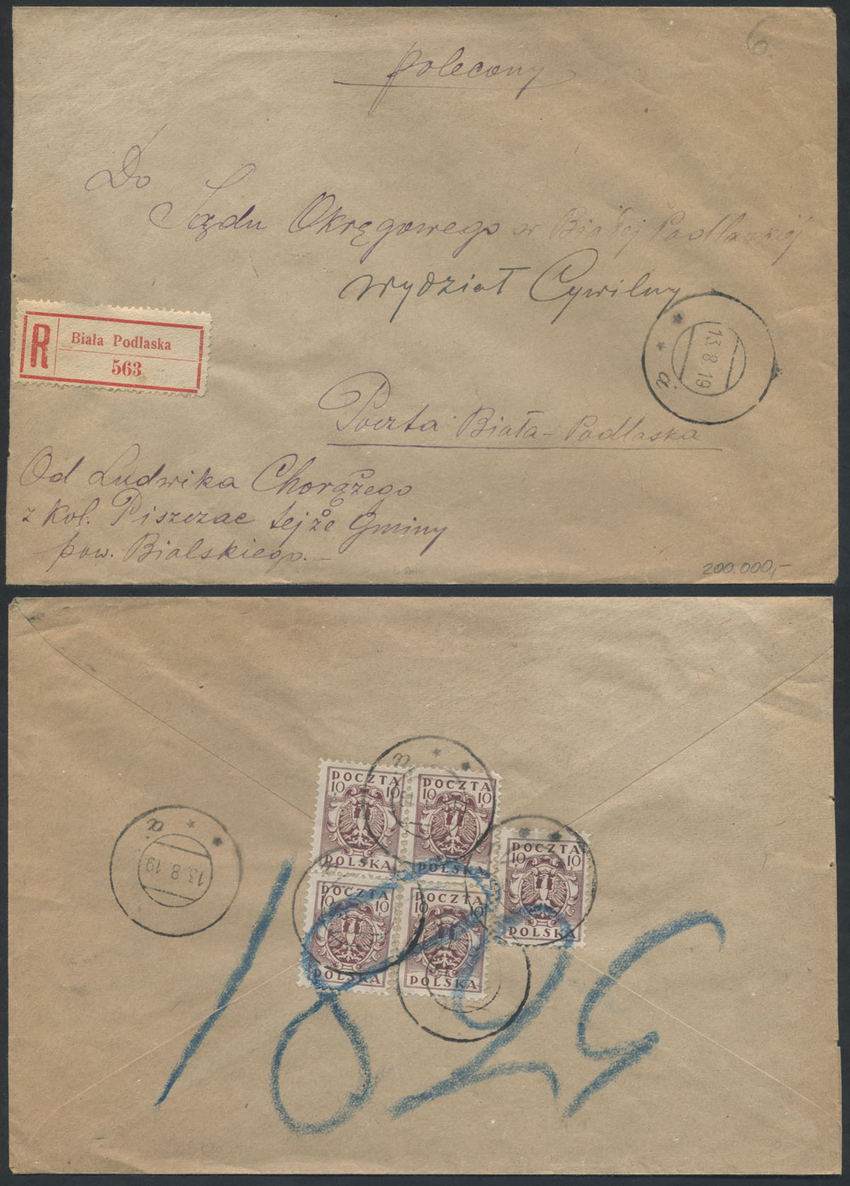 1919 miejscowy list polecony z Białej Podlaskiej, prowizoryczna czerwona erka i prowizoryczny "niemy " datownik. | Fi.87B |