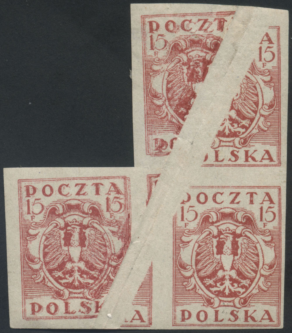 1919 wydanie w walucie markowej, marginesowa pionowa parka znaczków za 15 fen., dolny z niekatalogowanym - ale opisanym w PZP pod numerem 59, błędem na poz.15 "skośnie przecięta ramka pod literami KA", gwarancja Walocha. | Fi.88B B Mi.104 |