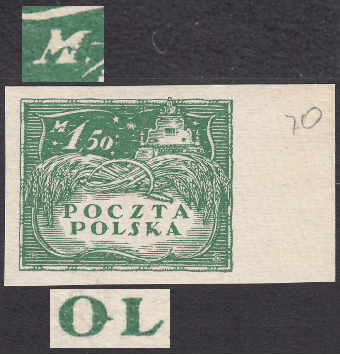 1919 wydanie w walucie markowej, znaczek za 1,50 mk. z niekatalogowanym błędem na poz.70 "kropki w M i po O w POLSKA" (zwykły znaczek Fi.85.-), gwarancja i opis Walocha. | Fi.93A B Mi.97 |