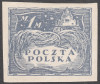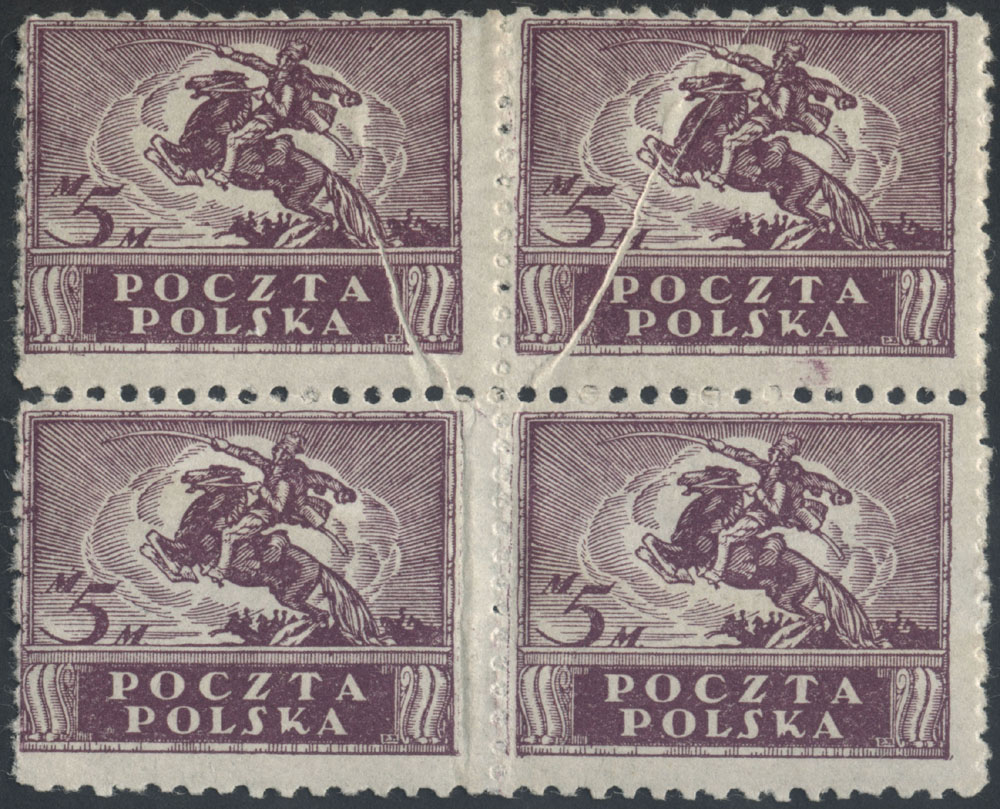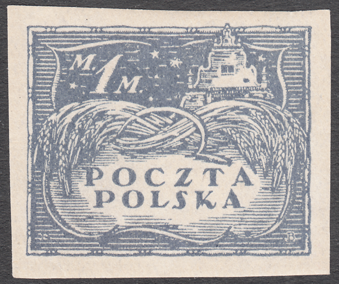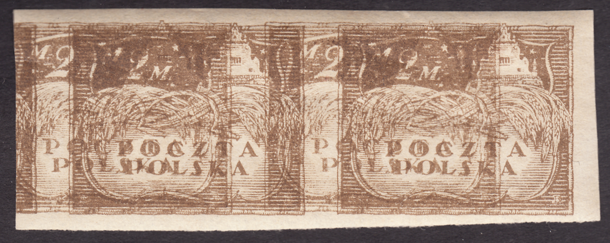 1919-20 wydanie w walucie markowej dla obszaru całej Rzeczypospolitej - nakład C, znaczek za 1 mk. w kolorze czarnofioletowym na białym prążkowanym pionowo papierze bez perforacji poziomej na dolnym marginesie, w tym nakładzie błędy perforacji są znacznie rzadsze niż w nakładach z 1919 roku, gwarancja Krawczyk. | Fi.92fC Mi.109zI |