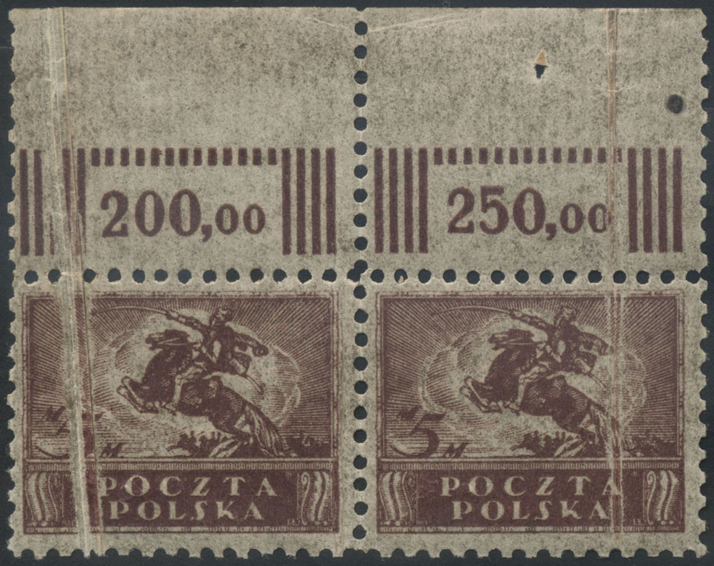 1919 wydanie w walucie markowej, pionowa parka znaczków za 5 mk., górny z katalogowanym błędem na poz.71 "bomba przed koniem" i niekatalogowanym "skośne kreski przed bombą i w łuku cyfry 5", a dolny z błędem "kropka w łuku cyfry 5", gwarancja. | Fi.96B B1+96B Mi.114 |