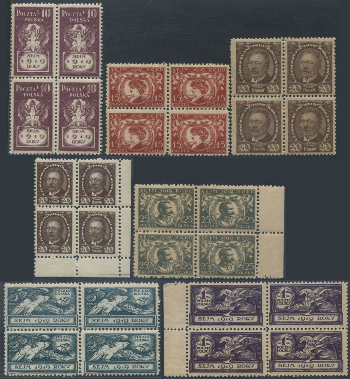 1919 pierwsza sesja Sejmu Ustawodawczego, seria w czworoblokach. | Fi.107-13 Mi.123-9 |