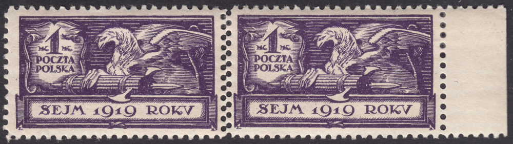 1919 Sejm Ustawodawczy - Orzeł, parka marginesowych znaczków za 1 mk. z nowo skatalogowaną na tej wartości podwójną perforacją pionową pomiędzy znaczkami, prawie niewidoczny ślad podlepki pomiędzy znaczkami i lekki na marginesie, bardzo ładny stan zachowania, gwarancja i opis Walocha. | Fi.113 MK3 Mi.129 |