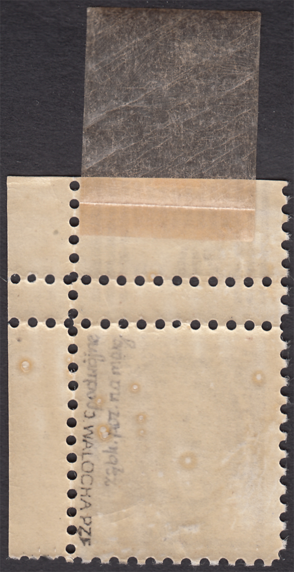 1919 I Polska Wystawa Marek, narożny czworoblok ciętych znaczków za 5+5 fen., z niezadrukowanym pasem (druk na fałdzie papieru), dodatkowo prawy górny znaczek z błędem "brak lewego szeryfa w rzymskiej cyfrze I", górne znaczki na podlepkach (Fi.80.-x1.5), dolne z oryginalną gumą bez podlepek (Fi.560.-x1,5), gwarancja z oznaczeniem MK Walocha. | Fi.102A MK4 Mi.118B |