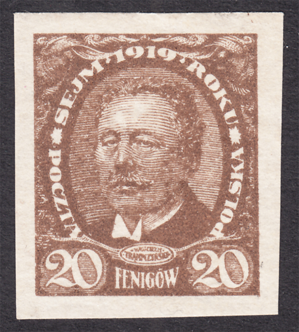 1919 Sejm Ustawodawczy - Marszałek Sejmu W.Trąpczyński - mały format, bardzo rzadka jako gumowana próba znaczka za 20 fen. w kolorze brązowym (Fi.900.-) - w zasadzie jak wykończony znaczek cięty, katalogowane próby nie mają gumy, mocno przebarwiona, ale obserwowana od kilku lat nie zmienia się, gwarancja. | Fi.110 P3 Mi.126 |