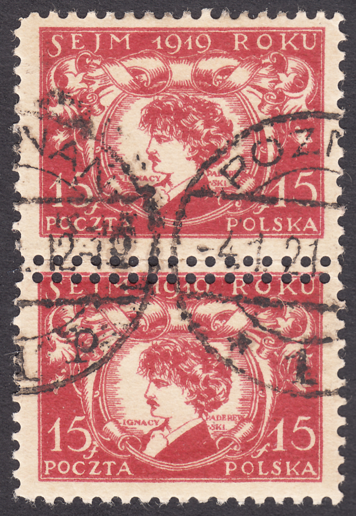 1919 Sejm Ustawodawczy - I.Paderewski, pionowa parka kasowanych znaczków za 15 fen. z podwójną perforacją poziomą pomiędzy znaczkami, w tej formie niakatalogonawe, inna wartość z podwójną perforacją poziomą (Fi.90.-), gwarancja Walocha. | Fi.108 MK Mi.124 |